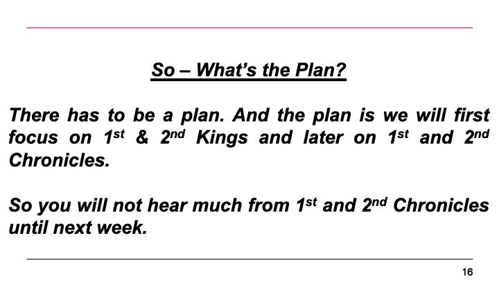 There has to be a plan. And the plan is we will first focus on 1st & 2nd Kings and later on 1st and 2nd Chronicles.