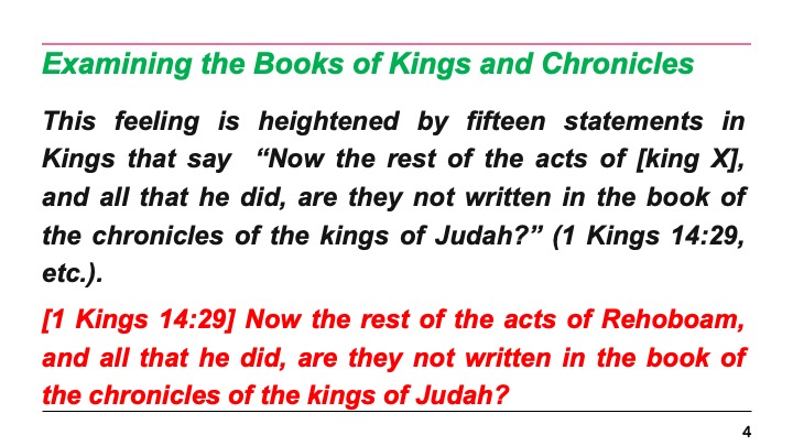 This feeling is heightened by fifteen statements in Kings that say “Now the rest of the acts of [king X], and all that he did, are they not written in the book of the chronicles of the kings of Judah?” (1 Kings 14:29, etc.).