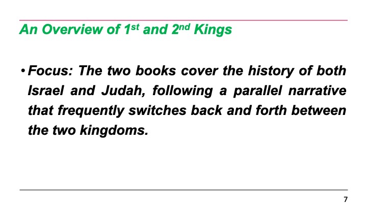 • Focus: The two books cover the history of both Israel and Judah, following a parallel narrative that frequently switches back and forth between the two kingdoms.