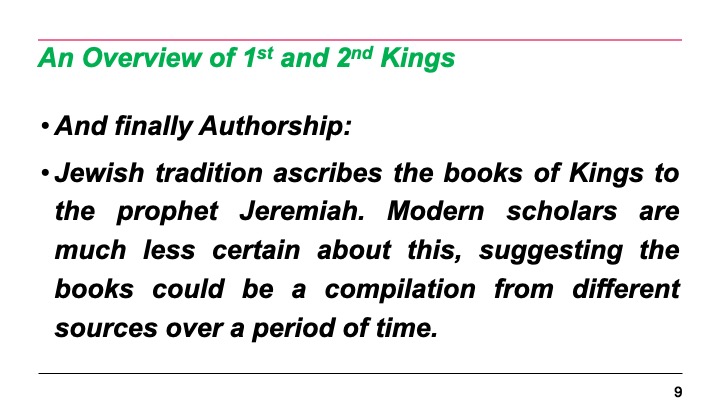 • Jewish tradition ascribes the books of Kings to the prophet Jeremiah. Modern scholars are much less certain about this, suggesting the books could be a compilation from different sources over a period of time.