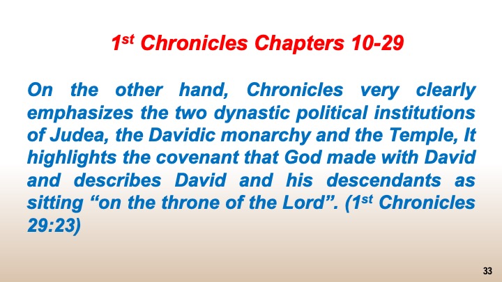 On the other hand, Chronicles very clearly emphasizes the two dynastic political institutions of Judea, the Davidic monarchy and the Temple, It highlights the covenant that God made with David and describes David and his descendants as sitting “on the throne of the Lord”. (1st Chronicles 29:23)