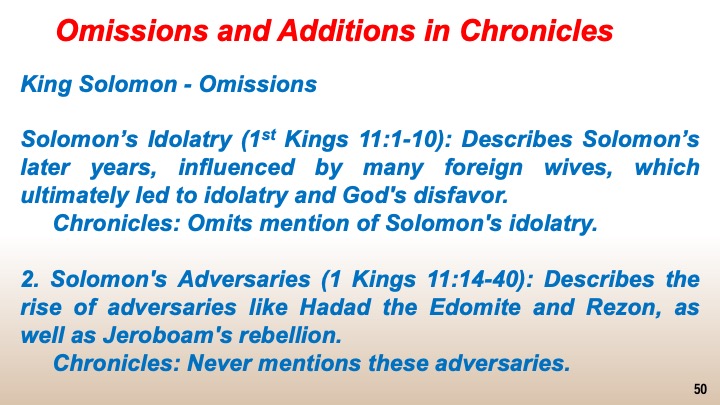 Much has been made by scholarship in both Judaism and Christianity by the rather surprising omissions and additions in the books of Chronicles when it comes to David and Solomon as well as some of the later Davidic Kings as compared to the descriptions in the books of Samuel and Kings.