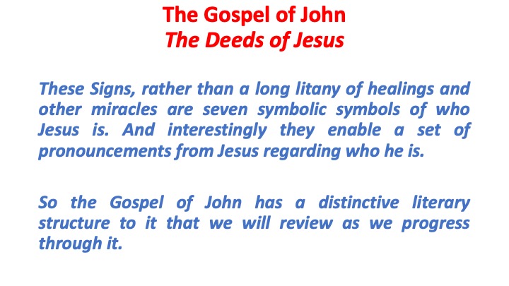 These Signs, rather than a long litany of healings and other miracles are actually seven symbolic symbols of who Jesus is. And they enable a set of pronouncements from Jesus regarding who he is.