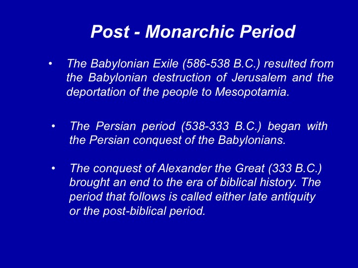 Finally, there is the late period, closing out the era of biblical history. There were three distinct periods in the Post – Monarchic period.