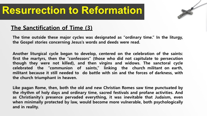 Time itself was sanctified by an ever-more elaborate liturgical year that served to bring the biblical past into the present by celebrating moments in the history of salvation and the life of Christ.