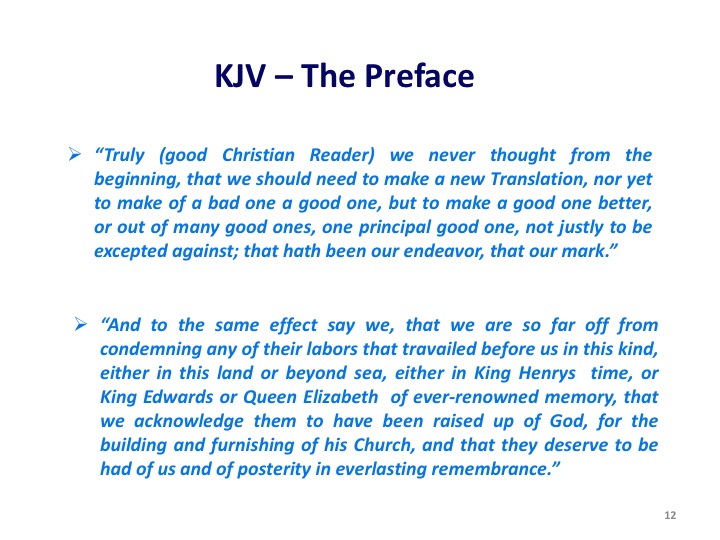 “Truly (good Christian Reader) we never thought from the beginning, that we should need to make a new Translation, nor yet to make of a bad one a good one, but to make a good one better, or out of many good ones, one principal good one, not justly to be excepted against; that hath been our endeavor, that our mark.”