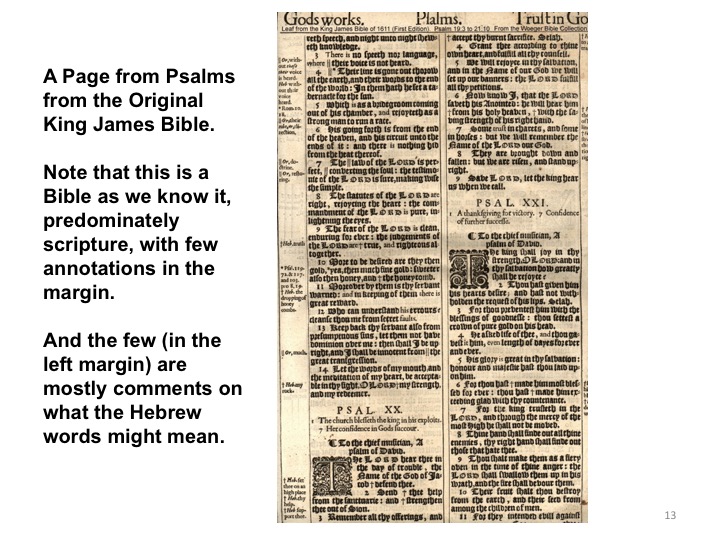 After the English Bibles we discussed last week, beginning with John Wycliff’s middle English translation done in in the 14th century, and I will review that list for you again in slide three, we will move forward thru four more English Bibles, concluding with the famous and important King James Version. In fact most of today’s discussion will be about the King James.
