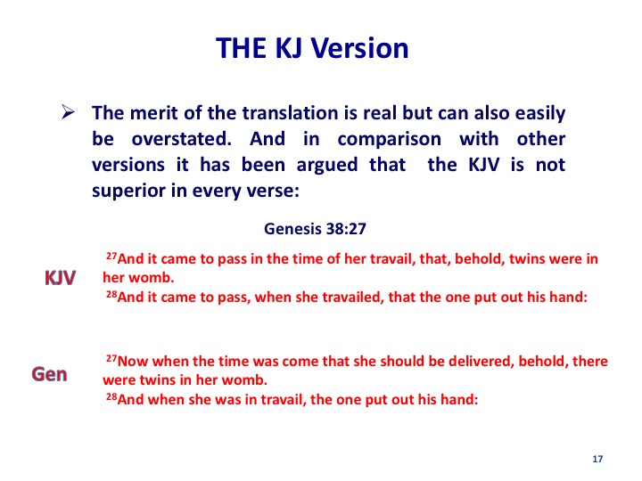 The merit of the translation is real but can also easily be overstated. And in comparison with other versions it has been argued that the KJV is not superior in every verse: