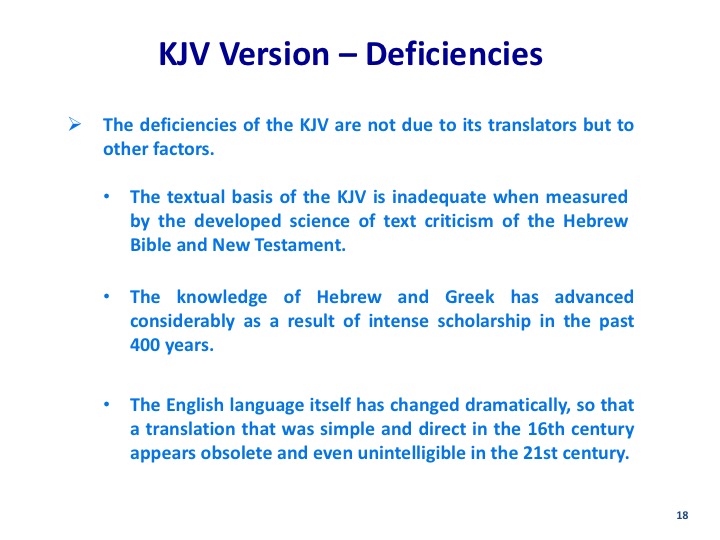 The textual basis of the KJV is inadequate when measured by the developed science of text criticism of the Hebrew Bible and New Testament.