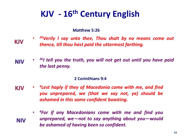 The English language itself has changed dramatically, so that a translation that was simple and direct in the 16th century appears obsolete and even unintelligible in the 21st century. This is a fact that is hidden from us by our constant use of the KJV. And when we use it we are seldom asked to interpret what we just read- Can you parse that sentence?