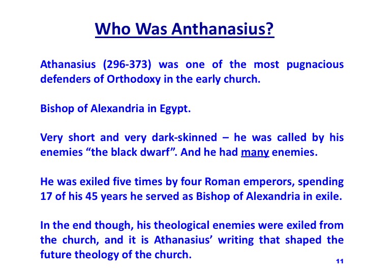 Athanasius (296-373) was one of the most pugnacious defenders of Orthodoxy in the early church. He was the bishop of Alexandria in Egypt. Very short and very dark-skinned – he was called by his enemies “the black dwarf”. And he had many enemies. After Constantine made Christianity a legal religion of the Empire he became very concerned that Christianity was in a major conflict between the "orthodox" camp and the "Arian" camp. Arias was a Bishop who questioned the newly emerging Doctrine of the Trinity and the notion of Jesus having two natures - fully human and fully divine. The Council of Nicaea was convened by Constantine to agree to only one form of Christianity. Athanasius represented the orthodox position and debated Arias in a furious interchange that finally resulted in a vote of the Bishops in favor of the newly drafted Nicene Creed. Arias and many of his followers refused to sign off on the creed and they were then banished into exile by the Emperor.