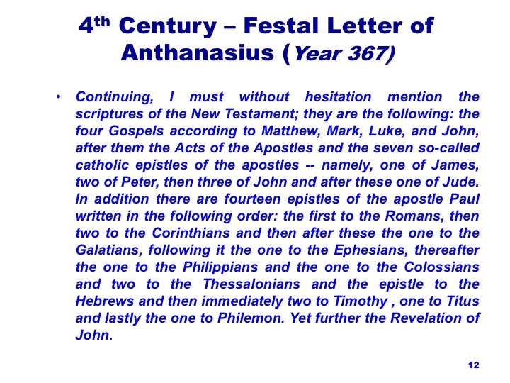 It had become a tradition in the emerging church that the Bishop of Alexandria each year wrote a Festal letter to all of the Bishops declaring the dates for that year of things like the beginning day of Lent and the Sunday of easter. Athanasius wrote the Festal letter in 367 and took advantage of its wide circulation to also weigh in on what he considered the canon to be.