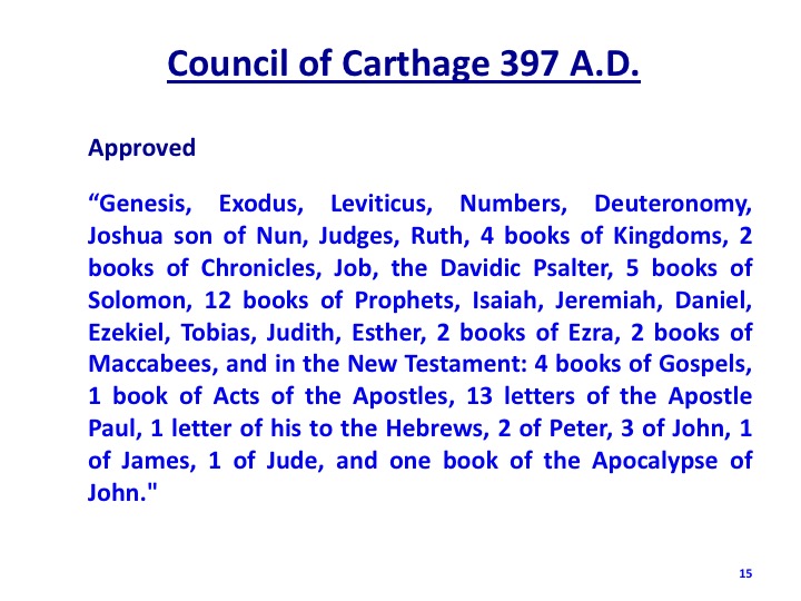 The first "official" canon came out of the Council of Carthage in the year 397. This was the canon of the old and new testaments for Christianity. It was presented without much fanfare in the reports from the Council: