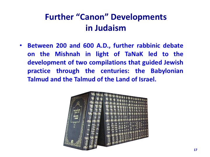 The canonization of the Hebrew bible eventually resulted in a confirmation of an ongoing process but it was a process that was also partly forced by external factors. As you may recall from our earlier classes the numerous sects within Judaism had major differences as to what was acceptable religious text in the early part of the 1st century of the common era.