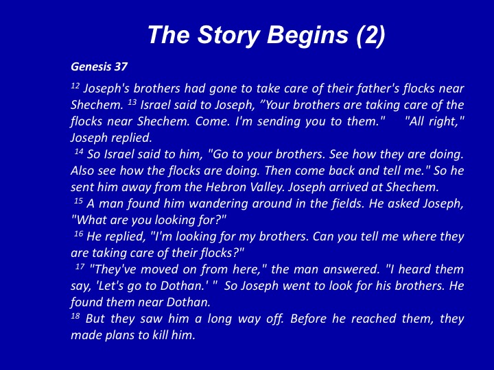 And the story continues as Israel sends Joseph in search for his brothers. And we here learn the now familiar story of how Joseph’s brother’s plan to get even with him.