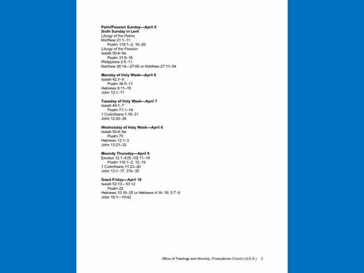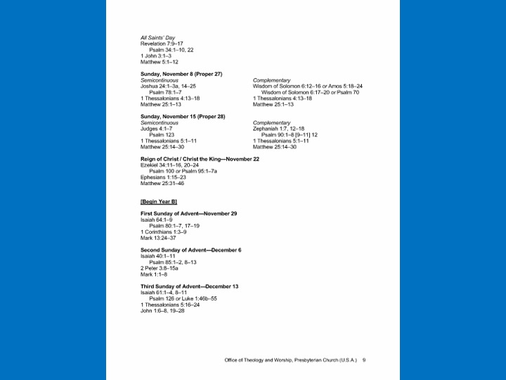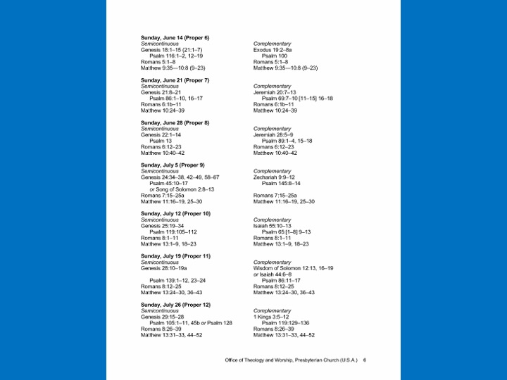 In the next 3 slides I will briefly show you three pages from the 2020 Revised Common Lectionary for Presbyterian Church USA (that's us). The 2020 Lectionary is actually about 9 pages long, but I just wanted to give you a feel for what it looks like.