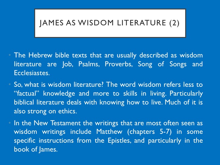 But we are not going to do that. Because as I said earlier James is a very interesting book, both historically during the development of the canon, and in the many discussions that came about as Christianity evolved. So we are going to be reviewing a lot of that background before then doing a dive into the text itself. And we will be discussing James as wisdom literature, the only NT book normally described as wisdom literature. So we explore what that means.