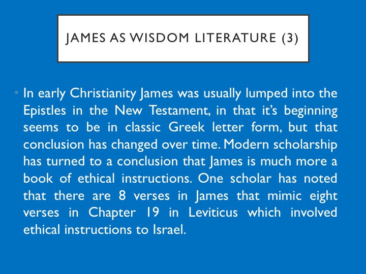 In early Christianity James was usually lumped into the Epistles in the New Testament, in that it’s beginning seems to be in classic Greek letter form, but that conclusion has changed over time. Modern scholarship has turned to a conclusion that James is much more a book of ethical instructions. One scholar has noted that there are 8 verses in James that mimic eight verses in Leviticus which involved ethical instructions to Israel.