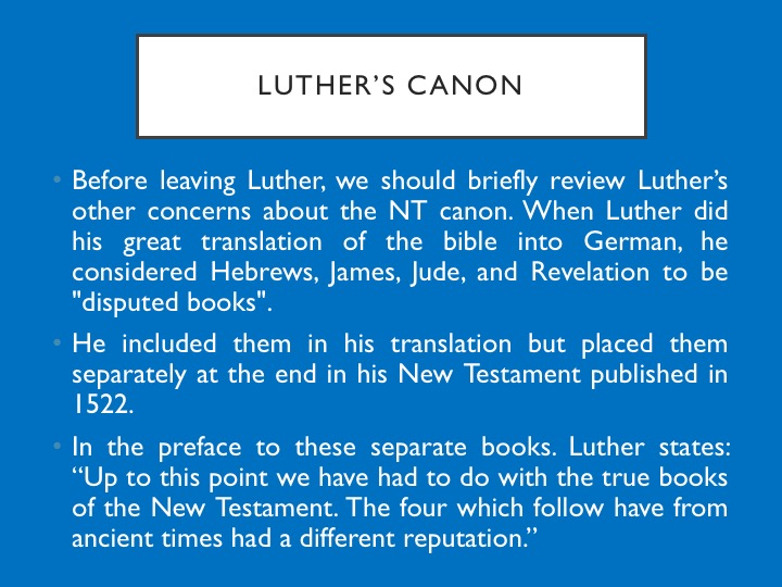 Before leaving Luther, we should briefly review Luther’s other concerns about the NT canon. When Luther did his great translation of the bible into German, he considered Hebrews, James, Jude, and the Revelation to be "disputed books". He included them in his translation but placed them separately at the end in his New Testament published in 1522. This group of books begins with the book of Hebrews, and in its preface Luther states, "Up to this point we have had to do with the true and certain chief books of the New Testament. The four which follow have from ancient times had a different reputation." Luther still considered Hebrews, James, Jude, and the Revelation to be "disputed books".