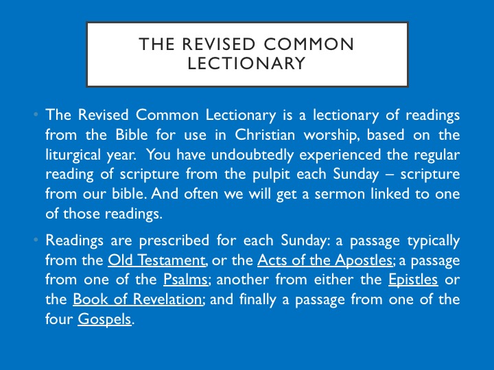 The Revised Common Lectionary is a lectionary of readings from the Bible for use in Christian worship, based on the liturgical year. You have undoubtedly experienced the regular reading of scripture from the pulpit each Sunday – scripture from our bible. And often we will get a sermon linked to one of those readings.