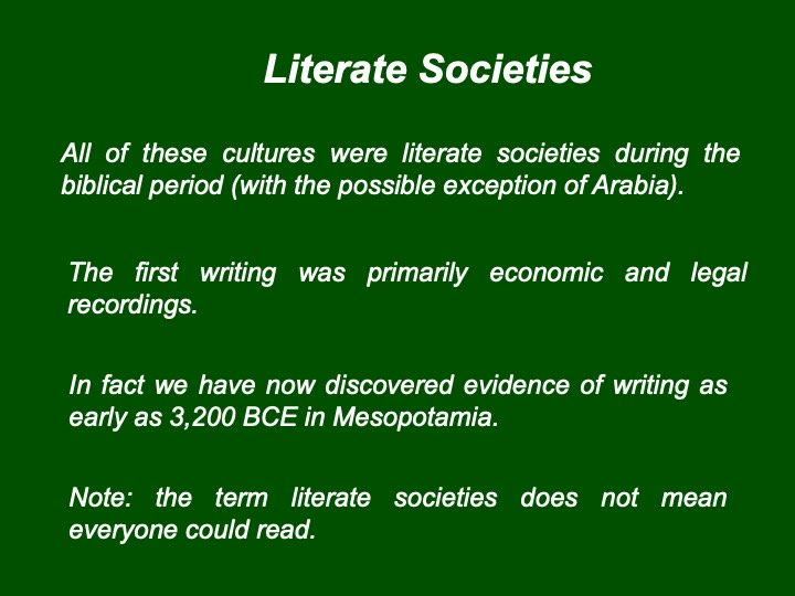 It is important to note that all of these cultures were literate societies during the biblical period (with the possible exception of Arabia). Moreover, their literary remains often share striking similarities with the Bible, as we have seen already and as we will continue to demonstrate as the course unfolds. Many scholars believe that the ancient near east was the first literate society.