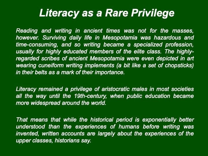 By the way – literate does not mean everyone could read – only a few select could read or write anything. And the earliest writing was not literature as we are talking about it – it was primarily economic recordings and later legal recordings.