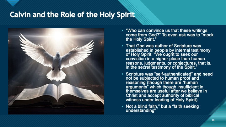 • That God was author of Scripture was established in people by internal testimony of Holy Spirit: “We ought to seek our conviction in a higher place than human reasons, judgments, or conjectures, that is, in the secret testimony of the Spirit.”