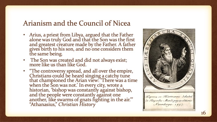 • Arius, a priest from Libya, argued that the Father alone was truly God and that the Son was the first and greatest creature made by the Father. A father gives birth to his son, and no one considers them the same being.