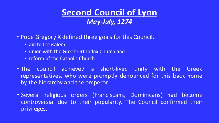 Pope Gregory X defined three aims for the council: aid to Jerusalem,