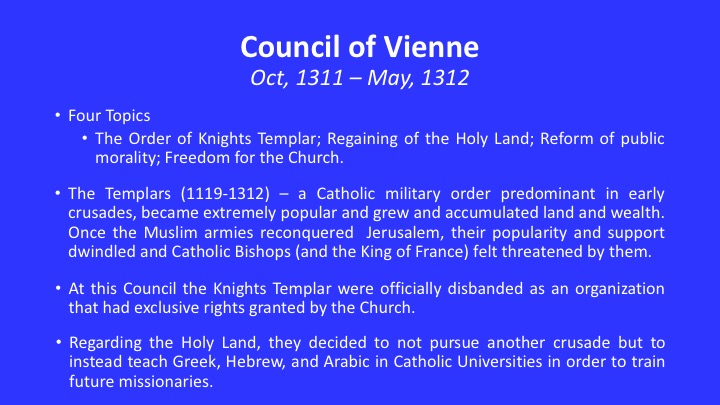 Pope Clement V solemnly opened the council with a liturgy, which has been repeated since in all Catholic ecumenical councils. He entered the Cathedral in liturgical vestments with a small procession and took his place on the papal throne. Patriarchs, followed by Cardinals, archbishops and bishops were the next in rank. The Pope gave a blessing to the choir, which intoned the Veni Sancte Spiritus. The Pope issued a prayer to the Holy Spirit, the litany of saints was recited and only after additional prayer did the Pope actually address the Council and open it formally. He mentioned four topics, the Order of Knights Templar, the regaining of the Holy Land, a reform of public morality and freedom for the Church. Pope Clement had asked the bishops to list all their problems with the order.