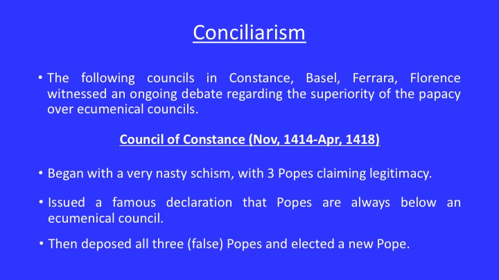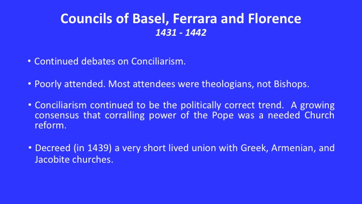 The following councils in Constance, Basel, Ferrara, Florence witnessed an ongoing debate regarding the superiority of the papacy over ecumenical councils. Conciliarism was a reform movement in the 14th-, 15th- and 16th-century Catholic Church which held that supreme authority in the Church resided with an Ecumenical council, apart from, or even against, the pope.