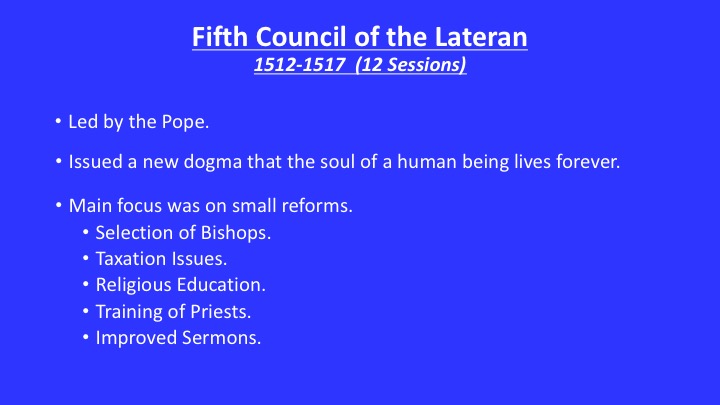 The Fifth Council of the Lateran opened under the leadership of the Pope in Rome. It issued a dogma that the soul of a human being lives forever. As previous councils, it condemned heresies stating the opposite without mentioning names. The opening sermon included the sentence: People must be transformed by holiness not holiness by the people. The issue was reform and numerous small reforms were approved by the council, such as selection of bishops, taxation issues, religious education, training of priests, improved sermons etc., but the larger issues were not covered and Pope Leo X was not particularly reform minded. The Council condemned as illegal a previous meeting in Pisa. The Council met from 1512–1517 in twelve sessions under Pope Julius II and his successor Pope Leo X.