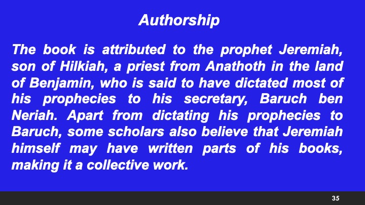 The book is attributed to the prophet Jeremiah, son of Hilkiah, a priest from Anathoth in the land of Benjamin, who is said to have dictated most of his prophecies to his secretary, Baruch ben Neriah. Apart from dictating his prophecies to Baruch, some scholars also believe that Jeremiah himself may have written parts of his books, making it a collective work.