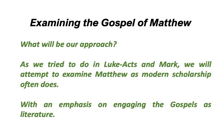 As we tried to do in Luke-Acts and Mark, we will attempt to examine Matthew as modern scholarship often does.