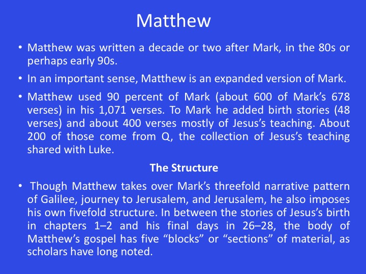 • Matthew was written a decade or two after Mark, in the 80s or perhaps early 90s.