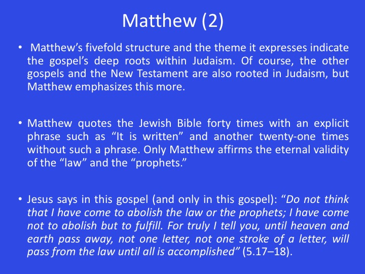 • Matthew’s fivefold structure and the theme it expresses indicate the gospel’s deep roots within Judaism. Of course, the other gospels and the New Testament are also rooted in Judaism, but Matthew emphasizes this more.