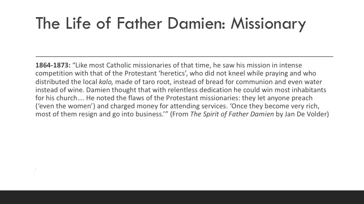 1864-1873: “Like most Catholic missionaries of that time, he saw his mission in intense competition with that of the Protestant ‘heretics’, who did not kneel while praying and who distributed the local kalo, made of taro root, instead of bread for communion and even water instead of wine. Damien thought that with relentless dedication he could win most inhabitants for his church…. He noted the flaws of the Protestant missionaries: they let anyone preach (‘even the women’) and charged money for attending services. ‘Once they become very rich, most of them resign and go into business.’” (From The Spirit of Father Damien by Jan De Volder)