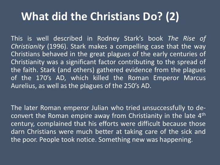 This is well described in Rodney Stark’s book The Rise of Christianity (1996). Stark makes a compelling case that the way Christians behaved in the great plagues of the early centuries of Christianity was a significant factor contributing to the spread of the faith. Stark (and others) gathered evidence from the plagues of the 170’s AD, which killed the Roman Emperor Marcus Aurelius, who did not get out of town quickly enough, as well as the plagues of the 250’s AD.
