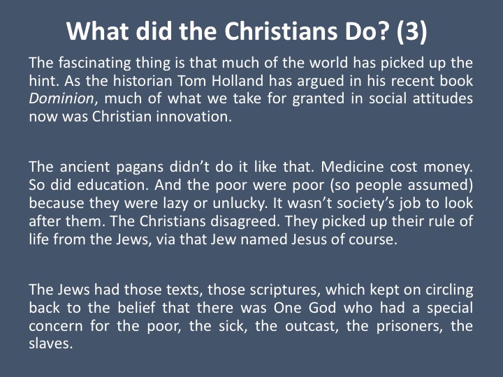 The ancient pagans didn’t do it like that. Medicine cost money. So did education. And the poor were poor (so people assumed) because they were lazy or unlucky. It wasn’t society’s job to look after them. The Christians disagreed. They picked up their rule of life from the Jews, via that Jew named Jesus of course.