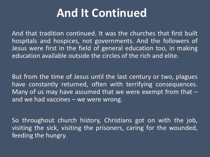 So throughout church history, Christians got on with the job, visiting the sick, visiting the prisoners, caring for the wounded, feeding the hungry.
