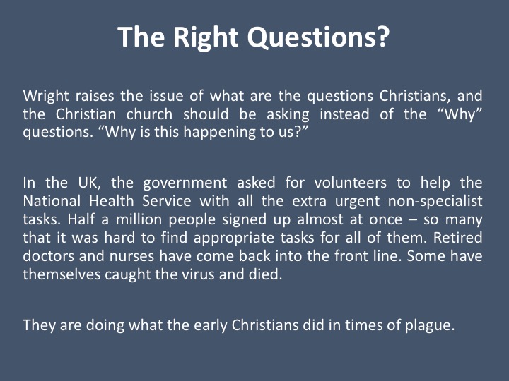 Wright raises the issue of what are the questions Christians, and the Christian church should be asking instead of the “Why” questions. “Why is this happening to us?”