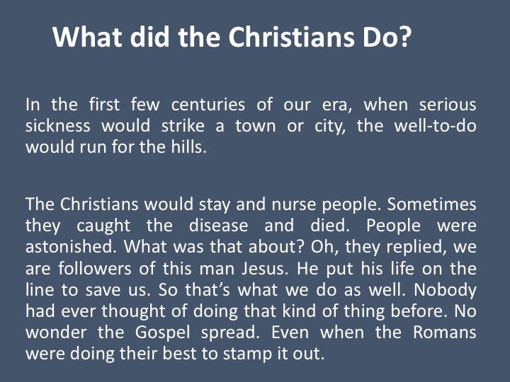 The later Roman emperor Julian who tried unsuccessfully to de-convert the Roman empire away from Christianity in the late 4th century, complained that his efforts were difficult because those Christians were much better at taking care of the sick and the poor. People took notice. Something new was happening.