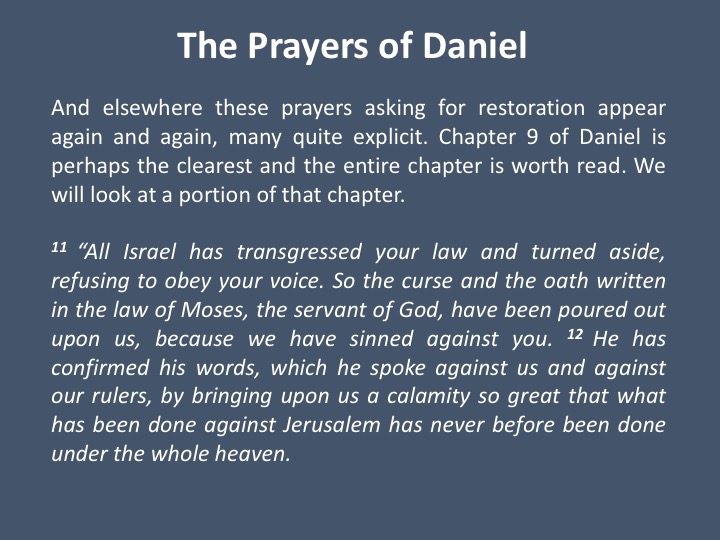 And elsewhere these prayers asking for restoration appear again and again, many quite explicit. Chapter 9 of Daniel is perhaps the clearest and the entire chapter is worth read. is worth a read.