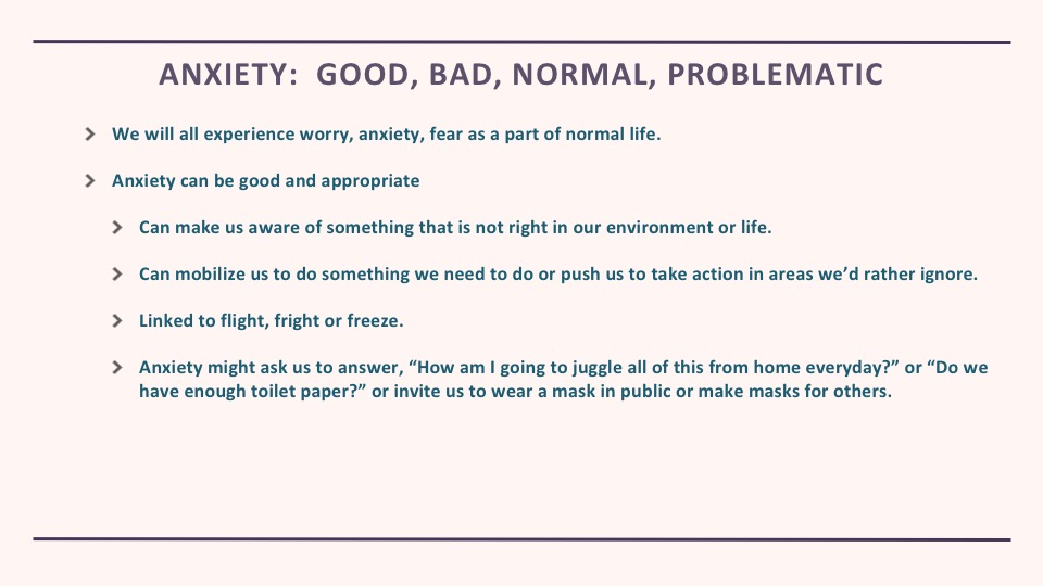 Anxiety might ask us to answer, “How am I going to juggle all of this from home everyday?” or “Do we have enough toilet paper?” or invite us to wear a mask in public or make masks for others.