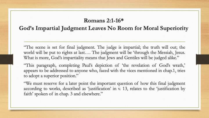 “The scene is set for final judgment. The judge is impartial; the truth will out; the world will be put to rights at last…. The judgment will be ‘through the Messiah, Jesus. What is more, God’s impartiality means that Jews and Gentiles will be judged alike.”