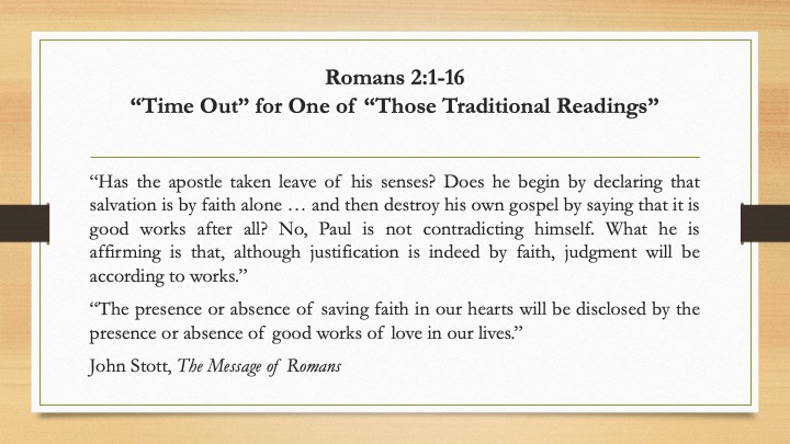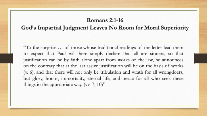 “To the surprise … of those whose traditional readings of the letter lead them to expect that Paul will here simply declare that all are sinners, so that justification can be by faith alone apart from works of the law, he announces on the contrary that at the last assize justification will be on the basis of works (v. 6), and that there will not only be tribulation and wrath for all wrongdoers, but glory, honor, immortality, eternal life, and peace for all who seek these things in the appropriate way. (vv. 7, 10)”
