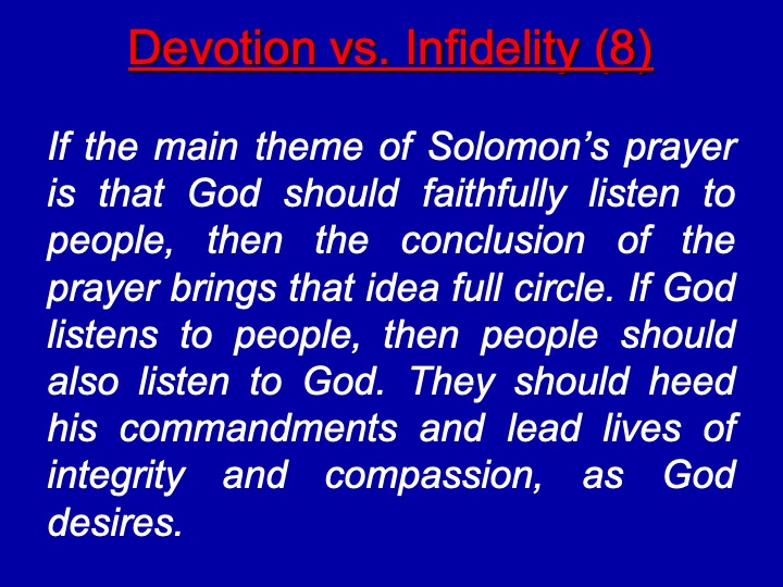 If the main theme of Solomon’s prayer is that God should faithfully listen to people, then the conclusion of the prayer brings that idea full circle. If God listens to people, then people should also listen to God. They should heed his commandments and lead lives of integrity and compassion, as God desires.
