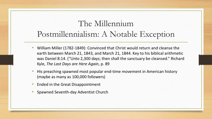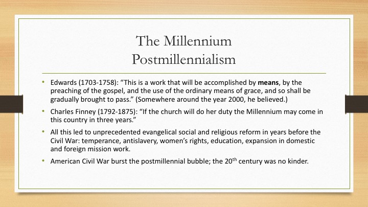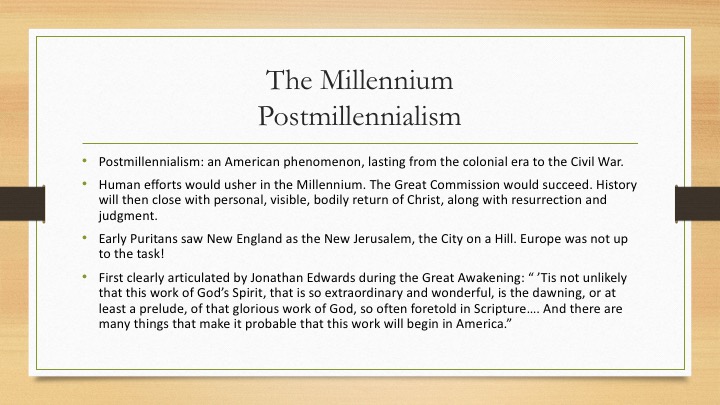 Postmillennialism: an American phenomenon, lasting from the colonial era to the Civil War.