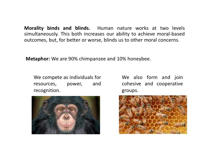 Morality binds and blinds. Human nature works at two levels simultaneously. This both increases our ability to achieve moral-based outcomes, but, for better or worse, blinds us to other moral concerns.