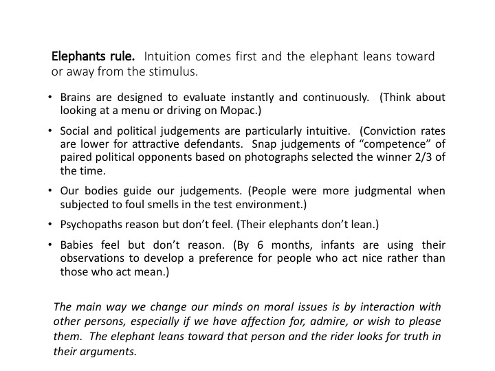 The main way we change our minds on moral issues is by interaction with other persons, especially if we have affection for, admire, or wish to please them. The elephant leans toward that person and the rider looks for truth in their arguments.